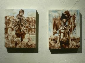 We stopped by Jarrett’s opening at SubBasement Studios at the beginning of the evening. I was excited about Jarrett’s newest paintings, mostly small and sepia toned, with a mixture of beautiful formal elements and menacing, dark subjects.