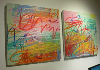 I have to admit that I am not a huge fan of bright, loud, and luscious color. I don’t trust it – it always feels too artificial, too happy to be believed. In any observed color scheme, earthy colors and shadows set the stage for bright and intense accents. Louisa Chase turns these natural color relationships on their ass, using ONLY high key and intense color, with the occasional white thrown in, but still manages to achieve a credible balance between nature and artificiality. As if there were a mathematical aspect to her intuition, Chase layers color upon color in her quick and unselfconscious hand, clearly understanding the transient nature of color based on visual ratios. The end effect is visually dazzling, both jarring and harmonious, with odd little moments of surprise. These works are deceptively simple and, once you get beyond your Cy Twombley associations, quite satisfying, especially if you love the way your eyes feel when they’re experiencing intensely competing colors.