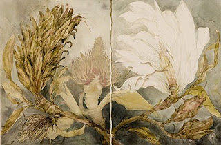 I’ve always liked the way Christine Neill’s message and media reinforce one another. These paintings could be simply romantic or pretty, floating somewhere between a botanical study and a natural still life, but manage to go somewhere else. Dense with earthy color despite a liquid and washy approach, Neill’s forms hint at a natural, subconscious language. They’re not about the nature you experience when you go into the woods, rather, about what nature symbolizes. Taken out of their context and blown up, not unlike O’Keefe’s floral technique, these objects function as totem or icon and demand your attention. They don’t point to what the objects actually are or their physical structures, but to what they might mean.