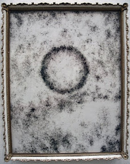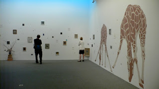 Jack: After considering Marin Hassinger and Dawn Gavin, I want to talk about Geoff Grace and his expansive wall installation in the back gallery. His work bookends the work by the two previously mentioned artists. Not because it looks like theirs in any way but because it locks in the exhibition “narrative”. His mostly wall bound installation is lateral and cinematic. It too rides the rails of misty humanistic/political persuasion. It too rides the rails of misty humanistic/political persuasion. Grace has made it to the “final five” each of the three years the Sondheim Prize has been offered, so he must have very complicated connection to the process. I find his work this year to be far more compelling than in years past. Truth is I can’t remember clearly what he did before so that’s a problem for one of us. This years work, with its three wondrous wall-sized giraffes portrayed neck down in awkward sweet drinking mode is pitch perfect effective. (I can’t help but think of the creatures as self-portraits). The rest of Grace’s long wrap around wall is covered in a minutia of ephemera—one off camera obscura images, drawings, his large collection of found washers and other seemingly personal artifacts all placed irregular but with a balance one associates with Eastern art.