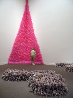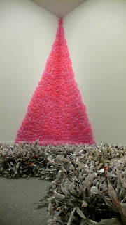 Cara: Hassinger’s message is entwined with the raw materials she chooses, seemingly harvested from the recycling bin. She deals with the emotion of love in her thirty-foot pyramid of pink plastic shopping bags that contain ‘love notes’ in each. Like an ancient pyramid, it towers mightily and functions as either a totem or an altar. Despite the goofy pink glow cast on the walls, there is a conflicting sense of wry cynicism working against a more idealistic vision. Duality also abounds in “Wrenching News,” the twisted stacks of bound newspapers arranged like gridded dreadlocks on the floor transform bad news into a meditative, repetitive, and healing process.