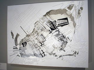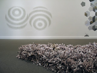 Al: Of the artists in the show, I was most surprised by the inclusion of Becky Alprin’s slickly designed, attractive black and white plastic reliefs. Again, young and promising, but in this context? These works would look just fine in many galleries. But as the back corner of this year’s award show, closer inspection of content oscillating between plants and architecture evaporates into nothing specific, leaving me with an uneasy sense of the curatorial wisdom in including these highly decorative and very sellable, generic works. I attempted to project a certain apocalyptic desire for meaning into the architectural floor pieces, but found their three visual seconds as silicone coated as her glibly polished technique- shedding both identity and place with alacrity. It is this curatorial misunderstanding of generalities as somehow being universal in implication, that only years of working in the studio clarifies- at least in my experience as a teacher and artist. Are the three curators harboring a few latent interior designer motives?