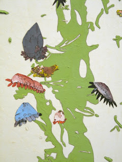 Cara: Melissa Dickenson’s cut paper pieces possess a similar sincerity and optimism to Grace’s. After a residency at the Awagami Papermaking Factory in Japan, Dickenson began making her own Awa-Washi paper by hand, and then painting on it, cutting it apart, and then stitching it back together. The paper has a presence of its own, stretched over wooded stretcher bars, it seems to be cloth or canvas, and then thin as a tissue in other places. Dickenson’s depictions of birds, flowers, and animals, in mostly sweet color combinations could verge on saccharine if they weren’t so honestly and lovingly crafted. Dickenson truly believes in the power and sanctity of animal and plant life, which is echoed in the rich imperfections and organic nature of the paper. I am guessing this artist spent her Sondheim exhibition allowance on framing, which was money well spent. The simple wood frames add a professional polish to each piece and reinforce their delicate and jewel-like aesthetic.