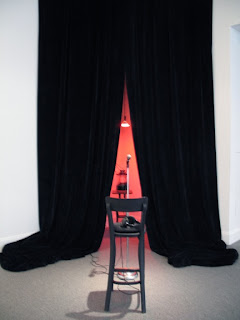 Al: Tony Shore’s black velvet paintings pack a classic wallop that is oil to conceptual art’s water. They are highly pleasurable presences to look at, even with his increasingly nuanced look into the ugly, horrific side of human nature. In turn, Laure Drogoul’s dramatic Frequencies for Darwin calls us to sing and perform for earthworms- throwing us back on our perspectives, yet also calling us with a tender, sly compassion I find exquisitely delightful. Best of all, it’s luridly erotic pink triangle framing the jar of earthworms between two dramatic black curtains cannily repeats Marin Hassinger’s inflated pink Love triangle in the front room. Then as one leaves the show, there is her dismembered, traumatized victim- Head of the Brave, hopefully singing away in a corner on the exit floor. It single handedly pokes at our war and politics, art history, cozies up to a tête-à-tête with Tony Ousler’s work, and hits a bull’s eye correspondence with Shore’s bludgeoning victims, like a silver bullet ricocheting off multi-dimensional walls.