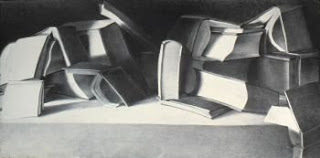 Cara: You attended graduate school at Yale for an MFA in painting, I believe. Recently, I attended a lecture in which you showed slides of graduate work and, ironically, these paintings were all of books. I think we saw over one hundred different paintings and drawings of hardbound books, each kind of crowded together Morandi-style, and each a bit different. What was your relationship with the subject matter at that time? Why were you painting books with such intensity?