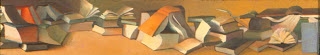 Barry: Each time I do a reading or presentation associated with the recent publication of “Crooked Tracks,” I do it differently. The Johns Hopkins talk was the first time I showed such a range of book paintings and drawings in over twenty years. I did that because the books worked well with several passages I wanted to read that evening. The passages from the novel were included in a chapter called “Sad Eyes,” in which I introduced the grandfather figure, one of the main characters in the novel. He was a man of books. His apartment was filled with them. When I wrote this chapter I literally placed all around me the few still life book paintings that I have left from this period, and I used them as inspiration and visual references for my description of the setting.