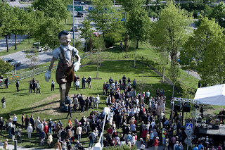 Jim Dine: “Why would a Swedish town want a thirty foot sculpture of an Italian folktale?” It’s true, some of the people from the town – about 50% – did not want this sculpture installed. Below is a photo from the unveiling ceremony. Dine said that there were several protesters at the event, holding signs and that he LOVED it. He said that he chose the meanest looking protester and gave him a hug and had their picture taken together. This is a pretty good indication of Dine’s general orneryness.