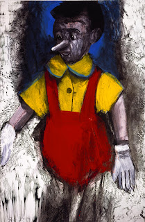 What is the deal with Pinichio? It is obviously the Disney version, too. This goes along with the obsession with childhood metaphors. Dine said that he saw the original version of the movie at age four or five and it made a huge impression. “Imagine the effect, if you’re a five year old boy and a liar,” he deadpanned. After finding an amazingly crafted vintage child’s toy, it became an inspiration for prints, drawings, and large sculptures. I definitely enjoyed the ‘Pinichio Cam’ images from the installation of the 30 foot Boras, Sweden sculpture.