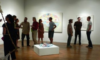 The more traditional, two-dimensional works develop these themes as well. Spirituality, nature, dreams, and doodles connect Patrick O’Malley, Seth Adelsberger, and Sarah Gamble. In O’Malley’s paintings and drawings meandering, interconnected lines create webs of Paul Klee-inspired landscapes or ‘mindscapes.’ From a distance, their oval and circular compositions seem light and decorative, while a closer look reveals baroque, obsessive detail.