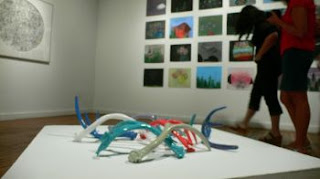 James Johnson’s installation deals with similar issues, but is a tougher sell. In ‘Forgotostay,’ his mixed media installation, there’s too much going on. A taxidermist’s bear head wears burning candles and gazes down at a circular pinwheel made of sticks. Gauzy films of bits of clothing and shreds of ribbons complete the circle. A religious, or shamanistic ritual is hinted out but not clearly defined. Issues of artificiality versus nature abound, but in no particular order. A wall collage with dream catcher strings competes with the round floor piece. Mysteries unfold, but some editing needs to occur for a transcendent experience.