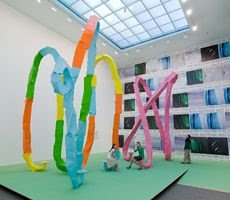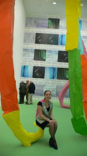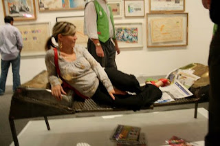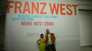 My partner in crime, Alex Ebstein of the Ten Tigers Blog, models with a lumpy plaster Franz West sculpture. You were supposed to choose one of several ‘bats’ and then view yourself with it in this newspaper-covered room. What does it mean? I think the this piece is meant to be taken literally – for what it is and nothing more. What does it mean? Exactly.