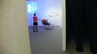 Furniture played a large part in this exhibit and most of it was welcoming. Above, Laure Drogoul reclines in a pink homemade lawn chair, next to huge, clear plastic lamps.
