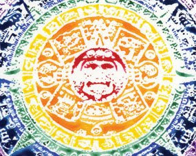 René Treviño’s flag pennants stream across the gallery by the hundreds, emblazoned with the Sun Stone, or Aztec Calendar, in a range of bright colors. Part used car lot, part Mexican family restaurant, they lead the eye to an ominous pile of construction materials that appear to have emerged from one of Magnolia Laurie’s paintings. Whether something is being built, or dismantled, is unclear. Elsewhere, Laurie’s smaller paintings capture barren landscapes crisscrossed with clotheslines and punctuated by explosions and random detritus, and Treviño’s renditions of the Aztec calendar appear as massive acrylic drawings on mylar.
