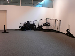 Here the lettering of both types of signage is carefully shaped and then abstracted so that it connotes its objects without carrying a precise denotation, showing us no particular brand, but instead the idea of a brand. In a parallel fashion, the physical elements of the landscape – large commercial buildings and chain-link fences – are rendered as nearly abstract. Buildings appear as simplified large blocks: the pair of cruciform towers in Front Lines, or in a panorama of interlocking shapes in Gulf. Fences, meanwhile, verge on being pure diagonal grids. In each case, we see an ambiguous flow between several different levels of things and their representations. The semi-abstract environment of letterforms, building blocks, and fence-grids comes to resemble a kind of three-dimensional diagram or plan, as much as it resembles a realistic view