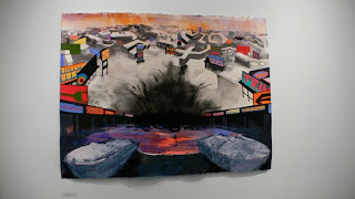 In some of the works, the ambiguity between work-as-object and work-as-image is emphasized by the application of cardboard panels to the surface of the painting. However, even within the pictorial window, any clear sense of a unified, readable space, and the viewer’s mastery of it, is frustrated. The works depict a world that is labyrinthine and difficult to navigate. This labyrinthine aspect and the presence of the deliberately haphazard cardboard panels are tied together thematically. Both suggest a disaster scenario, in which the physical structure of the environment is blurring and disintegrating, and in which artworks such as these must be pieced together from the materials at hand (i.e. scrap-cardboard). Furthermore, the suggestion of a disaster also might be open on to an interpretation of the techniques of abstraction discussed above. These pictures show the viewpoint of someone desperately trying to escape, whose view of the surrounding environment is therefore a blurred or distracted one, so that its precise details are left unclear, leaving only the semi-abstracted diagrams, such as those we see in Burnham’s work.