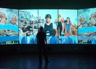 Scene after scene of Evans’s five-channel projection has deliberate order and disquieting disorder, creating a loose but provocative narrative around the subjects of power and population control, coded with interesting and often humorous subtexts. Empyrean’s themes are developed through an absurd juxtaposition of both benign traditions and disturbing pathologies: wellness tourism, missionary practice, and militaristic domination. Evans’s extensive investigation into his subjects is enhanced by a trained eye and impressive skill using image detail and color.”