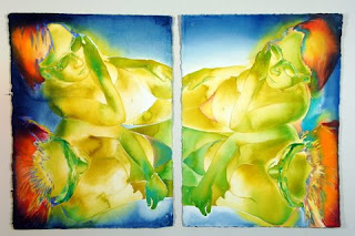 Texture is a strong element in the show. Tony Henson’s abstract expressionism pieces are full of rich texture created with brushes and fingers. Robert Mirek’s amorphous oil paintings stand about an inch off of the panels they are painted on, thick enough to cast a shadow. They are more like paint sculptures than traditional paintings. Unfortunately, his textured paper pulp sculptures are not as strong and seem out of place.