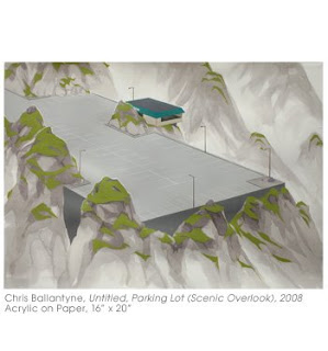 Next show: Chris Ballantyne: Recent Work at the Steven Zevitas Gallery. This is the gallery that includes Open Studios Press, the publishers of New American Paintings. I asked to check out some Peregrine Hoenig drawings, which they had a decent selection of in a plastic binder. Up close, Ballantyne’s paintings reveal a lot of the wood grain from the wooden panels they are painted on. They were a bit austere for my taste, but the wall painting energized the whole show.
