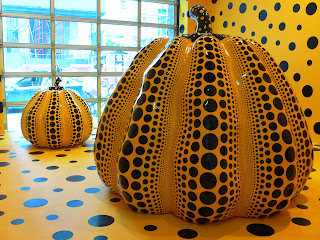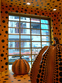 Paintings and pumpkin sculptures by Yayoi Kusama at Gagosian