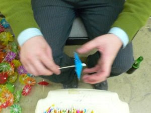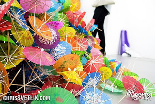 The ‘Umbrella Vine’ as many people call it is mainly about the action that goes with the object. There is no other object that uses the same actions one uses to open toothpick parasols. This ridiculous object with its utter uselessness comes with an action that is just as useless as the object itself. I put myself up to the task of learning this object and the action that goes with it inside and out, caring and obsessing over the task before me. As an art object or a souvenir of the actual art of opening, I leave a vine and a pile. The small pieces come together as one mass unit, showing the beauty and strength of repetition. These small, delicate items seem puny when looked upon singularly. When amassed into a pile of sharp points and colorful patterns, one fears falling over into them. The column of parasols is solid, one singular item, and no longer a number of smaller pieces but now a new, distinct object.