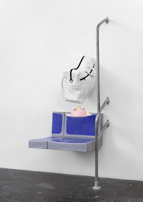 The other piece I almost missed in this first gallery is titled ‘The Lock’ (pictured below). On first impression, it looks like a lumpy Claes Oldenburg fragment. So what? Made of cast polyurethane, steel pipes, and electromagnets, this sculpture appears to be part of a public bus with a round pink cake levitating in the air over the seat and a white gym bag attached to the wall.