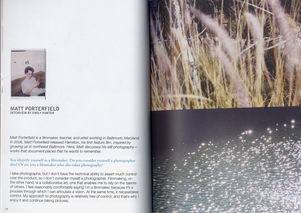 Matthew Porterfield was born in Baltimore, MD. He studied film at New York University’s Tisch School of the Arts and currently teaches screenwriting, film theory, and production at The Johns Hopkins University. His first feature film, Hamilton, which he wrote, directed, and edited on 16mm film was released in 2006. Metal Gods, his second feature script, won the Panasonic Digital Filmmaking Grand Prize at the 30th Annual Independent Film Week in 2008. In 2010, his latest film, Putty Hill, premiered at the Berlinale International Forum of New Cinema. Locally, Porterfield’s photographs have been shown at Baltimore’s Current Gallery and Gallery 229, he was featured in the fall 2008 issue of Locus Magazine, and has been awarded a media grant from the Maryland State Arts Council.