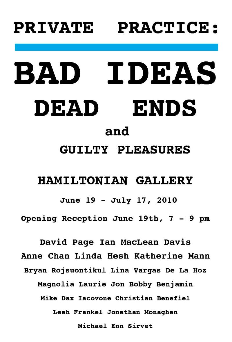Hamiltonian Gallery is proud to present Private Practice: Bad Ideas, Dead Ends and Guilty Pleasures.
