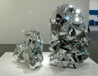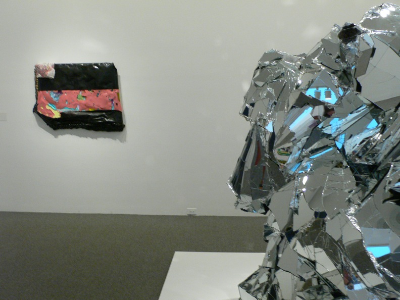 Matthew Janson’s works are creepy and beautiful, employing a David Altmejd-esque aesthetic of the grotesque, the theatrical, and the extreme. Wall pieces as well as 3-D are equally odd and embellished – with broken mirrors, bits of furniture, wild color, and found objects. When you enter the room, Janson’s larger-than-a-person mirrored scultpures sparkle like a giant, mangled disco ball, and as you walk around it, you wonder why it has wheels on it’s side.