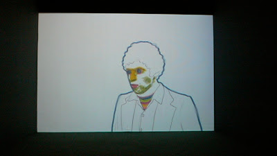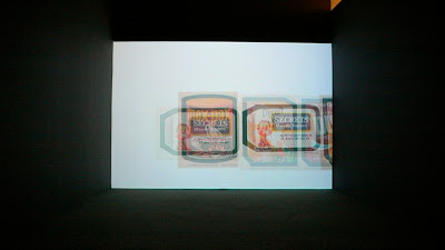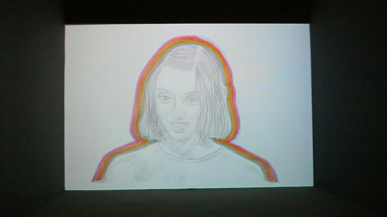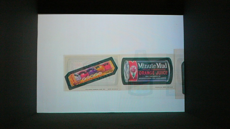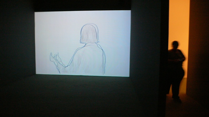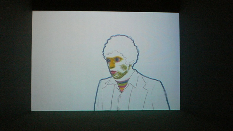 According to the BMA, Karen Yasinsky investigates how visual composition, editing, color, and sound creates emotional and psychological effects. To me, this sounds more purposeful and exact than the puzzling and open-ended narratives that Yasinsky builds. In this particular piece, Yasinsky traced several sections of Robert Altman films – California Split and Thieves Like Us – and she seems to be more interested in showing us her own ambiguous feelings or memories about these films, rather than a literal or thematic translation of them. Elliot Gould and Shelly Duvall are the two characters Yasinsky chose to draw and one isn’t sure if they are fighting, ignoring one another, or peacefully co-existing, with a montage of 1970’s processed food products at the end.