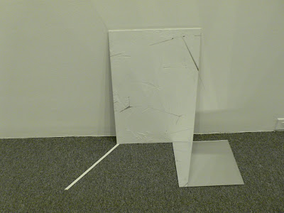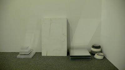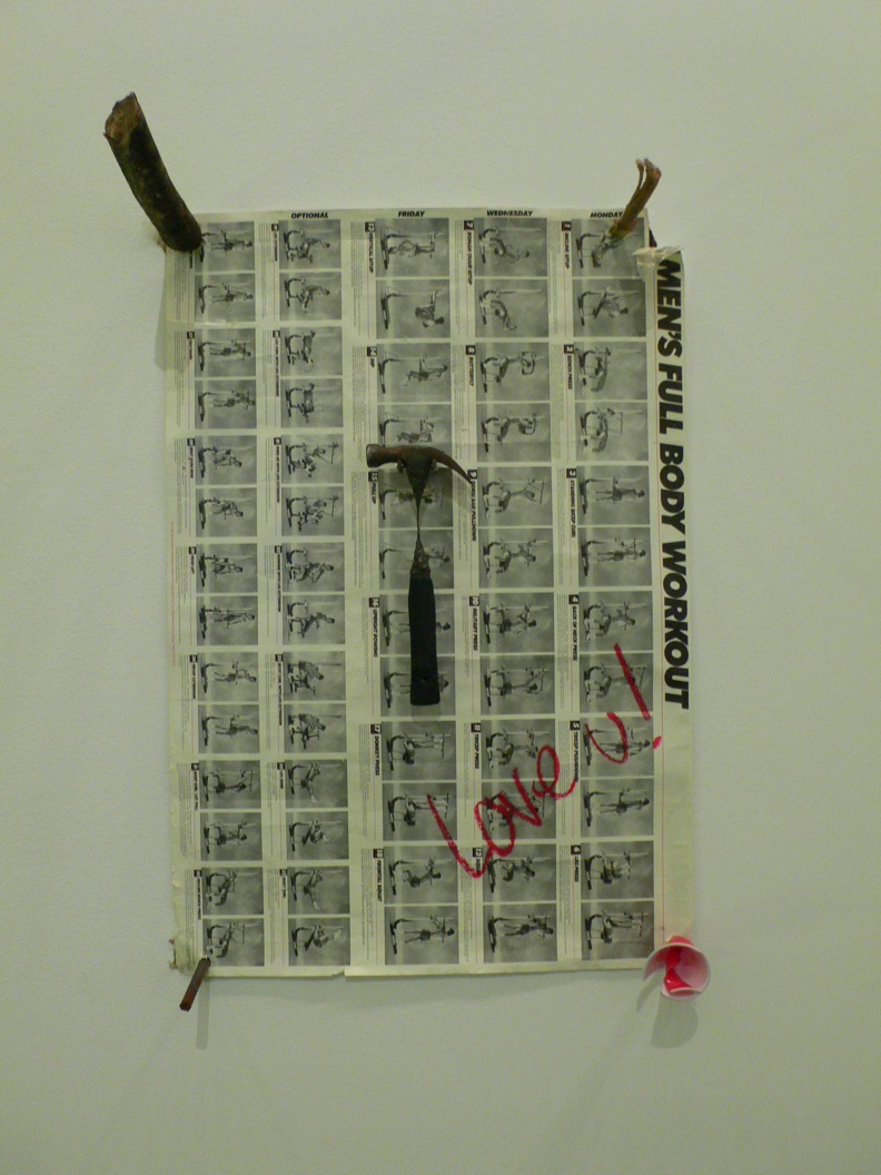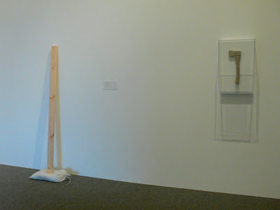 The other piece included in the photo above is called ‘Sediment Hatchet’ and is made from sediment collected from the bottom of a shop sink, mixed with a binding agent, and cast into it’s current shape. This is the work I have been more accustomed to from LaVoie – unusual materials cast into the shapes of tools and masculine objects. The other vitrine contains ‘Concrete Mickey Slippers’ (exactly what they are titled) and cast dumbbells made from pureed OK Computer CD’s. While it might seem a random choice, (heavy metal seems more macho, right?) Radiohead’s OK Computer is seen by many critics to be a masterpiece and deals with issues of consumerism, discontent with the modern world, and a sense of loss. LaVoie’s dumbbells might just be the ultimate symbol of the thinking and sensitive man’s modern dilemma: a choice between extremes in becoming an individual. In LaVoie’s world, traditional masculinity is a trap, but emo doesn’t seem to be a particularly appealing or authentic choice, either.