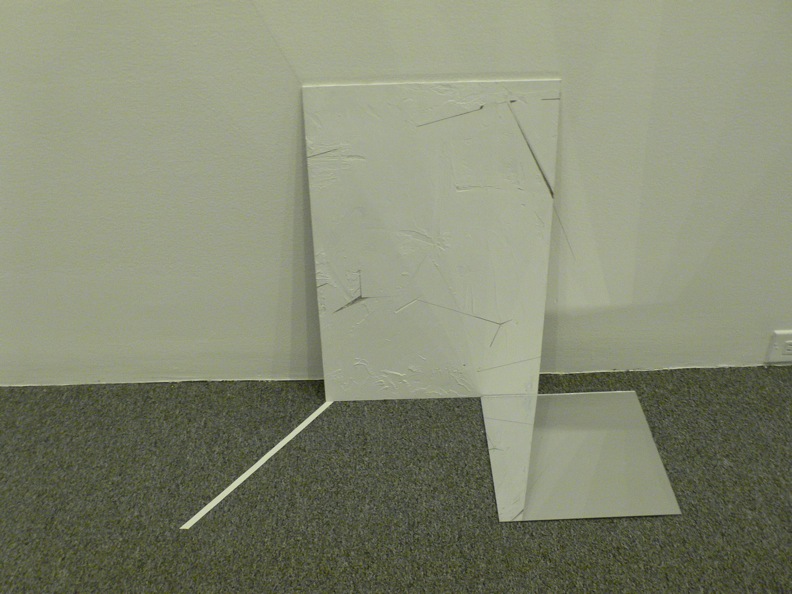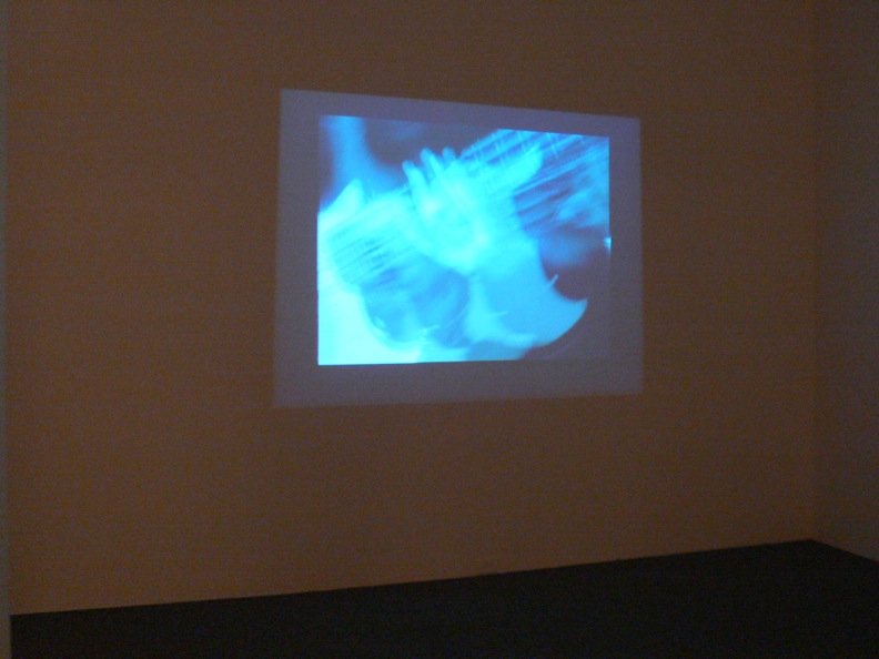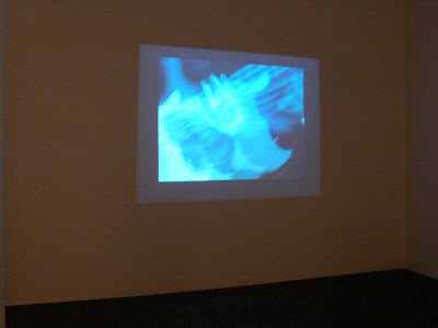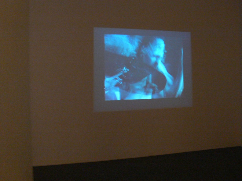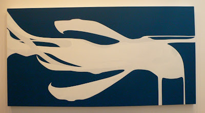 Hackett’s area is sparse; there are two giant paintings, each exactly as tall as the artist, which use only tones of blue and gray to depict abstracted images of whales. There is a video projection booth located around the corner, which echoes Hackett’s whale theme in sound and color. I think Hackett’s room would feel more integrated and complete without the separate room for the video – all three pieces, sounds included, would benefit from one continuous horizontal view, and would immerse the viewer more effectively.