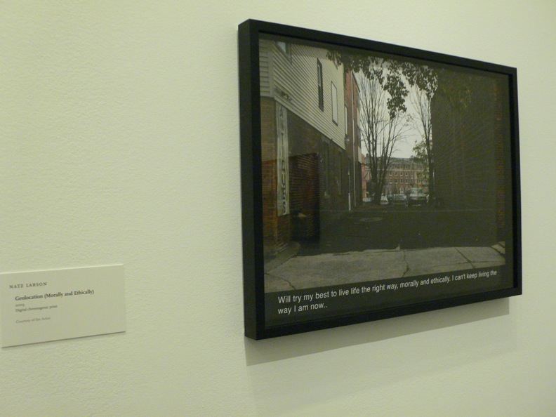 Larson’s tweet-o-graphs are catchy and satisfying. You relate to them immediately and you GET it. The photographs are beautiful. The framing is elegant and simple. The size of the prints is consistent, although they might be more powerful at a larger scale. The photos are neat and fun. This is also their problem. It’s too neat and too fun. After I walked around the gallery, looking and reading, and chuckling to myself, I had no more questions. This project was tightly conceived and executed. There are no loopholes. I don’t feel angry at this artist or confused or surprised. And I want to.