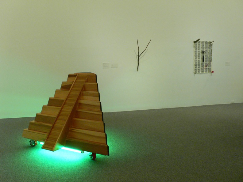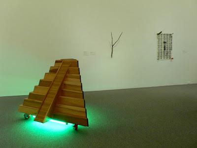 LaVoie’s largest piece appears to be a replica of an ancient mastaba on two sides, but it’s intense green lights projected from below transform it into a space ship or odd appliance. Titled ‘Energy temple,’ this piece is interactive. If you touch the triangle copper plate at the top, a low vibration emanates from it’s speakers. The more the hands that participate, the louder the sound. I haven’t figured out how this piece relates to the others, but, based on sheer size and slickness, it demands the lion’s share of your attention in this space.