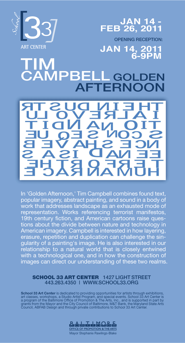 In ‘Golden Afternoon,’ Tim Campbell combines found text, popular imagery, abstract painting, and sound in a body of work that addresses landscape as an exhausted mode of representation. Works referencing terrorist manifestos, 19th century fiction, and American cartoons raise questions about the divide between nature and technology in American imagery. Campbell is interested in how layering, erasure, repetition and duplication can challenge the singularity of a painting’s image. He is also interested in our relationship to a natural world that is closely entwined with a technological one, and in how the construction of images can direct our understanding of these two realms.