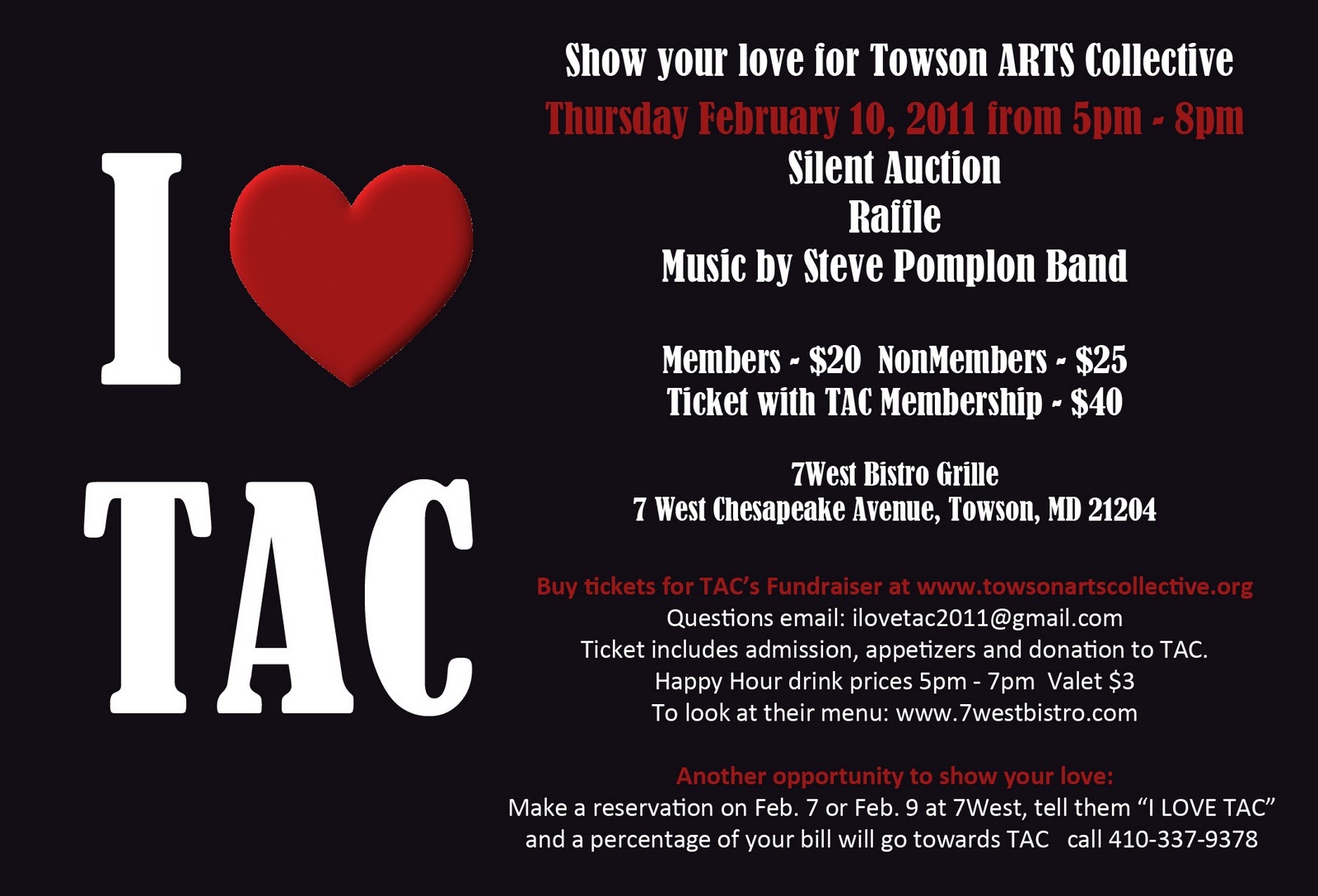 Four years ago, the red door of Towson ARTS Collective opened in an effort to bring the arts to the residents and visitors of Baltimore County. TAC is inviting everyone to come and SHOW THEIR LOVE for TAC during their first fundraiser. It will be on Thursday, February 10, 2011 from 5- 8pm. It will be located at 7West Bistro Grille which is located at 7 West Chesapeake Ave., Towson, MD 21204. Tickets can be bought online at www.towsonartscollective.org.