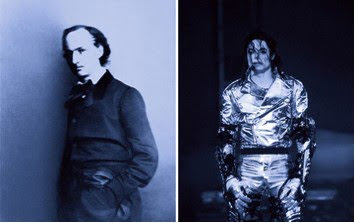 Lorraine O’Grady: O’Grady’s photographic series The First and the Last of the Modernists, Diptych 2, Green (Charles and Michael) (2010) juxtaposes images of French poet Charles Baudelaire and the late King of Pop Michael Jackson. O’Grady maintains that Baudelaire and Jackson, artists separated by nearly 150 years, occupied pivotal positions in their genres and shared similar character traits. By pairing images of Jackson with the few available images of Baudelaire, she contrasts the men at roughly the same ages as she tracks their oppositional trajectories: Baudelaire’s descent from an aristocratic family into poverty, and Jackson’s meteoric rise to wealth and fame.