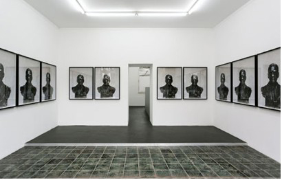 Rodney McMillian: McMillian questions preconceived notions of historical importance and how the viewer immediately creates a false history based on presumptions. Included in “Agitated Histories” is a series of identical photographs of a painted-black bust from McMillian’s Unknown (2006) project. The bust itself suggests that the unnamed figure was possibly of significance, but is contrasted by heavy damage and chips in the glossy black veneer revealing the white plaster beneath, marring the piece.
