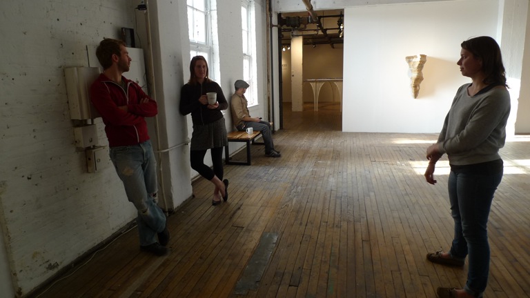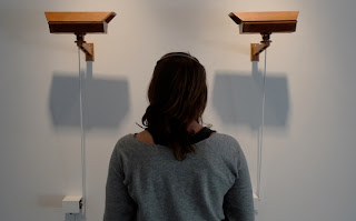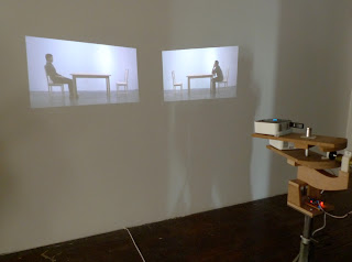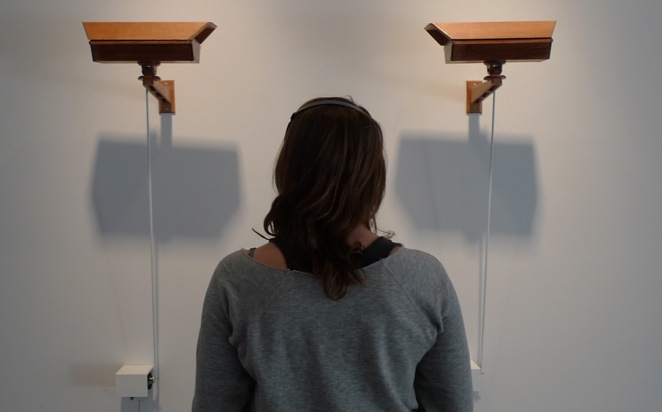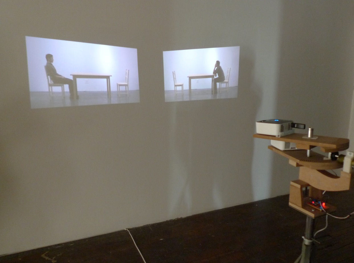 This familiar dance goes on indefinitely in Glance, a kinetic sculpture by Andy Holtin, part of Hypotheses: Recent Work and Collaborations at Gallery Four. The faces appear on separate video monitors, hung at eye level, that move in synch with the faces on their screens, powered by an electromechanical system designed by the artist. The piece is captivating, seamlessly uniting technology, a simple gesture, and a romantic narrative into a work of art anyone can relate to.