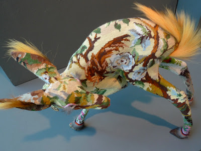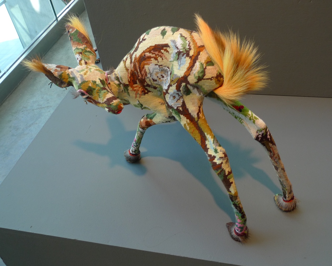 Frederique Morrel, founded by Morrel and Levin, is an artistic adventure designed to explore the realms of humanity’s origins: Adam and Eve, the animals of the Garden of Eden and paradise lost, using as raw material discarded vintage tapestries found in yard sales and thrift shops. Believing the natural connection humans once had with “true” art and the natural access to beauty has been lost to industry, the couple’s “artifacts” serve as their solution to “re-enchant the world” through their special ingredients to create happiness.