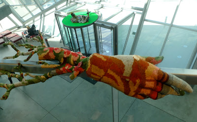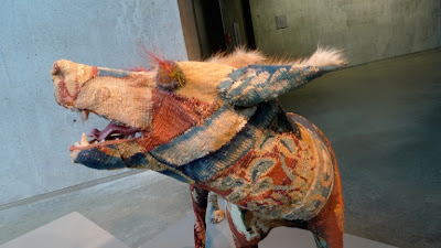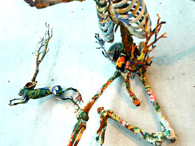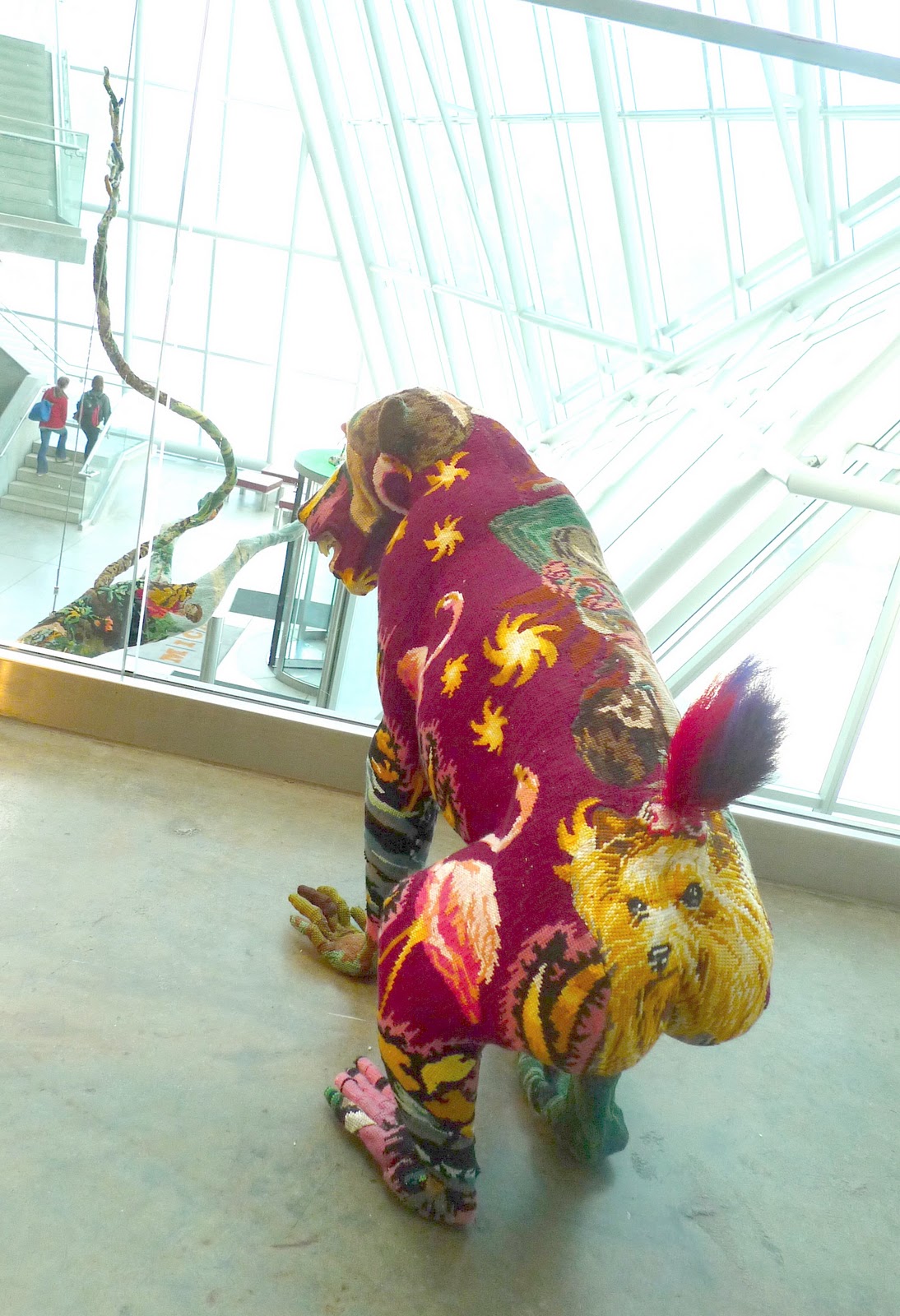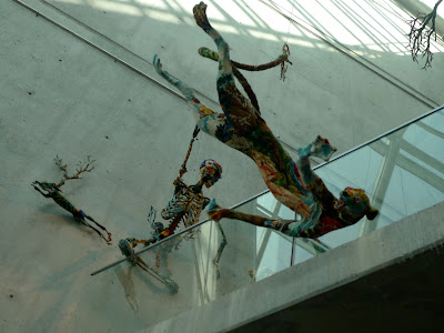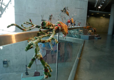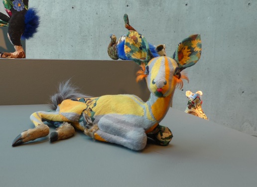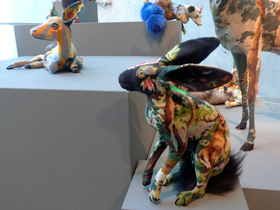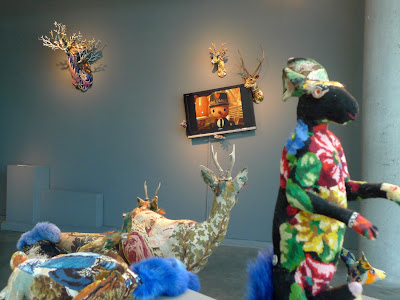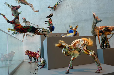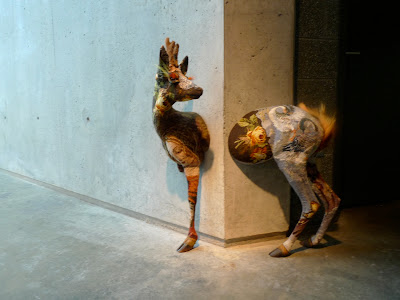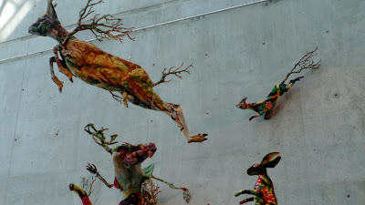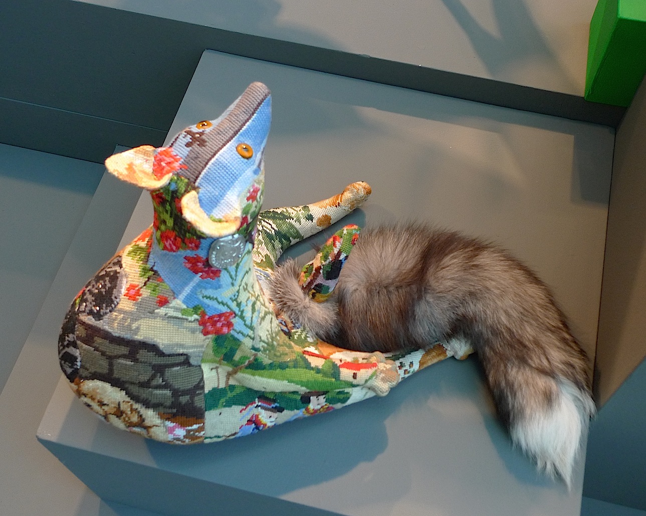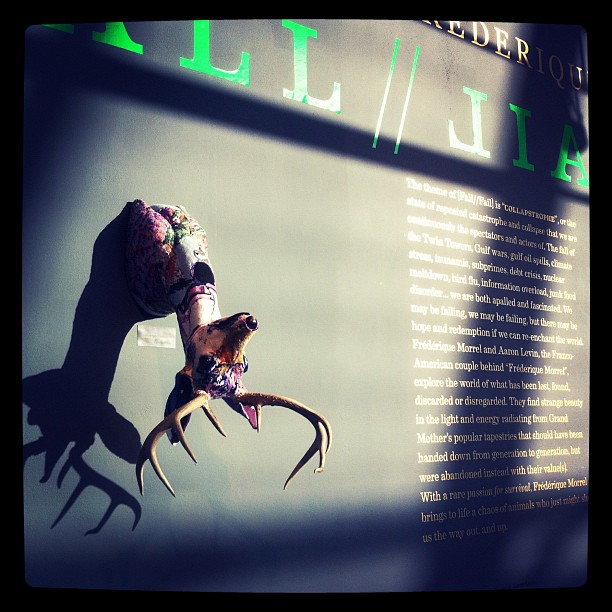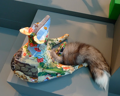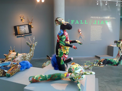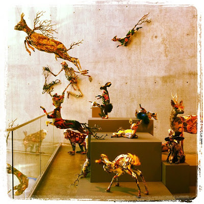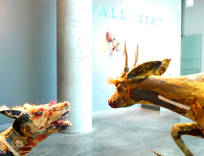 Although it is cool to look up and see animals jumping overhead, this building is way too busy and the animals get lost in its detail. It is a bit like architectural camouflage and this work is too good! It deserves white walls. Aside from this meager complaint, I found Fall/Fail, an exhibit by Parisian couple Frédérique Morrel and Aaron Levin to be one of the most satisfying I have recently seen. This work is exquisitely crafted, cute without being saccharine, whimsical, humorous, gorgeous, and also deadly serious. Just when I thought I was completely over taxidermy art, this work saves it.
