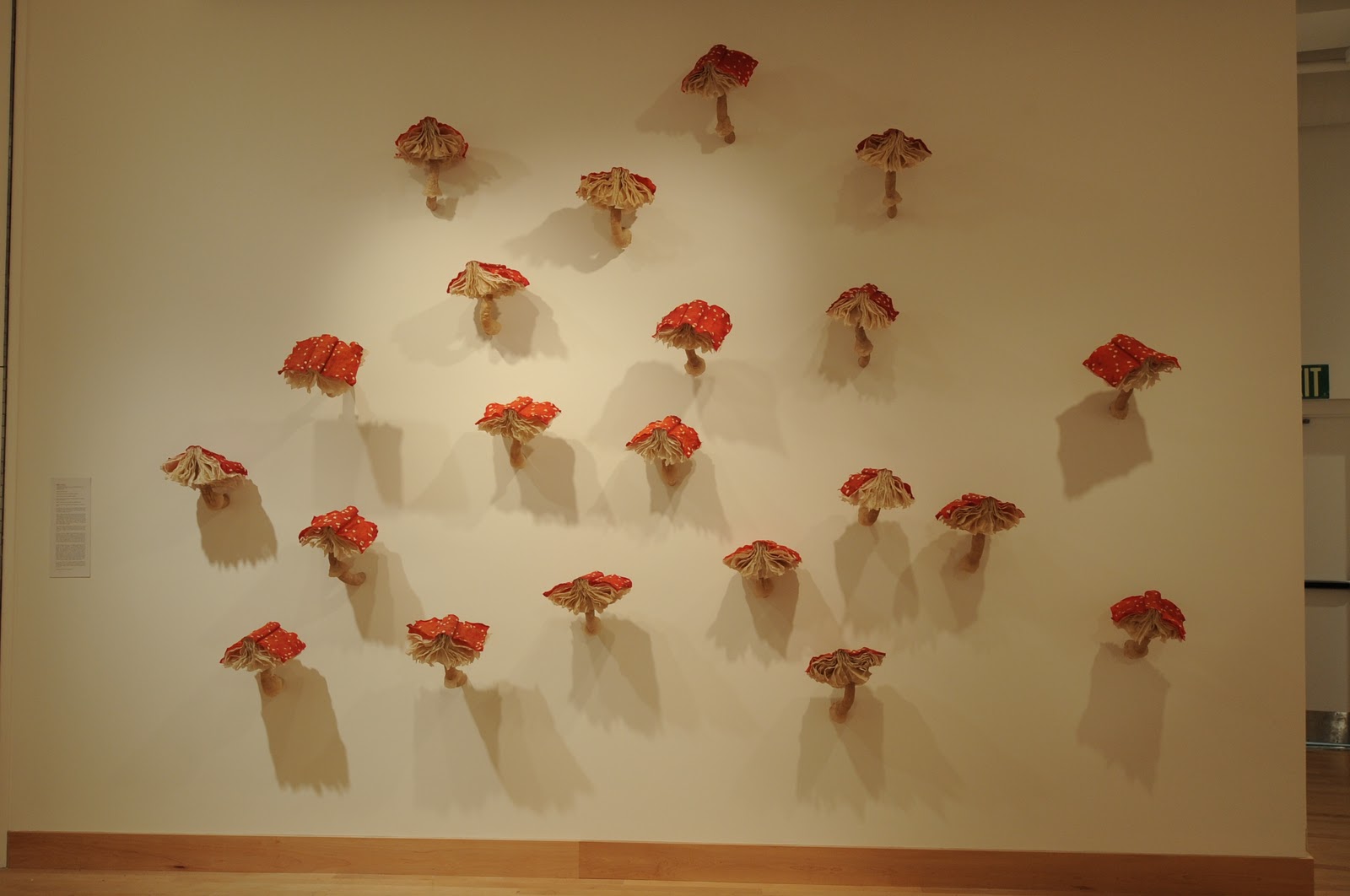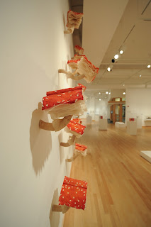 One of the largest and most colorful “books” in the exhibit is (S)Edition by Melissa Jay Craig. From a distance, the edition of ninety-nine hand-shaped books appears to be a swarm of red-capped toadstools growing off the wall. Closer inspection reveals that each sculpture is, in fact, a book, with a red, dotted cover and its pages unfurling underneath, like the striated gills of a mushroom cap. Besides its Alice in Wonderland sense of visual fantasy, (S)Edition has an emphatic message: Sedition literally means to incite a rebellion against authority. Just as fungi appear mysteriously and spontaneously, and feed off of the demise of another living organism, books are often powerful, subversive elements in society. Proliferating like, well, fungus, throughout history, the function of the book has been a powerful agent for change and progress.
