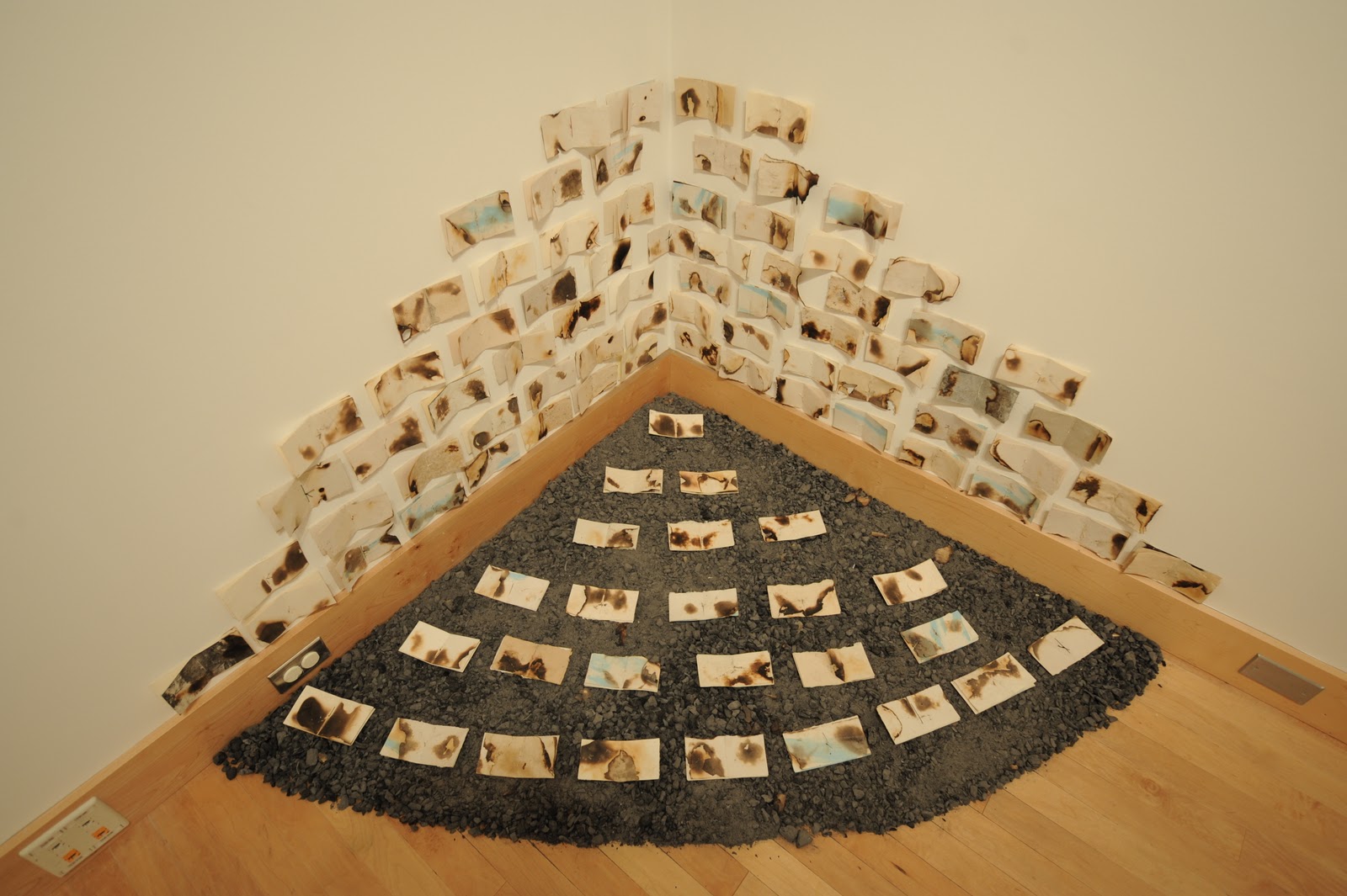 Michelle Wilson’s Libros Perdidos (Lost Books) installation explores the tradition of burning books by displaying one hundred small, handmade books, which have all been charred to varying degrees. From the historical destruction of thousands of Mayan and Aztec texts by Spanish conquistadors, to the mass book burnings by the Nazis in World War II, to the recent controversy surrounding Pastor Terry Jones’s burning of the Koran, Libros Perdidos acknowledges that the practice will likely continue into the future. Displayed above a bed of ashes in the corner of the gallery, this memorial for lost books mourns not only the information lost, but the people and cultures behind them.