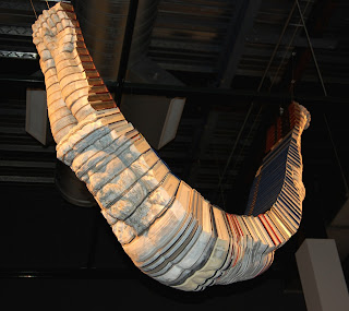 Another dramatic example of what a book can become is Long-Bin Chen’s Flying Angel 6. Hanging from the ceiling, this sculpture appears to be an arched human figure, and resembles the prow of a boat. The artist created the three-dimensional sculpture by collecting discarded books, stringing them together with the spines facing up, and then carving the entire form with chainsaws, drills, sanders, and scissors to create a human likeness. Stylistically similar to traditional Buddha sculptures, Chen’s Flying Angels are a larger than life reminder that paper debris, viewed as worthless by most people, can be repurposed and recycled into meaningful, enlightening creations.