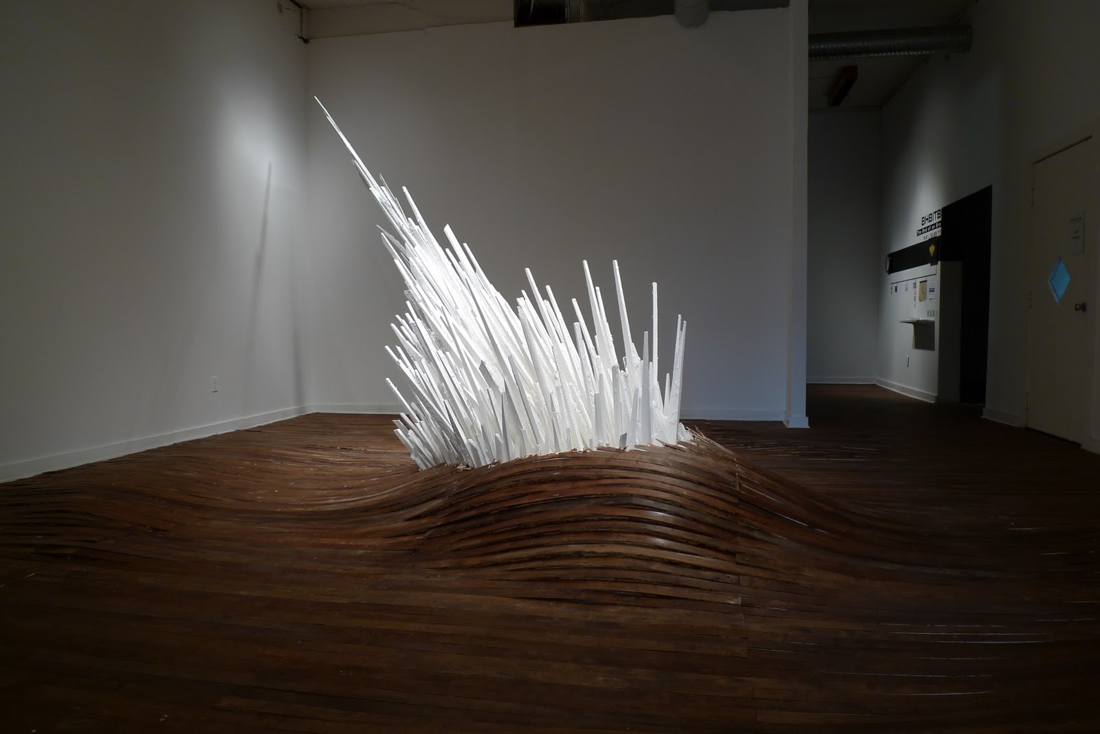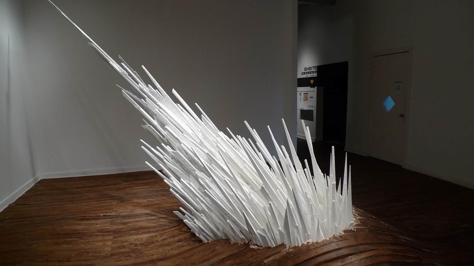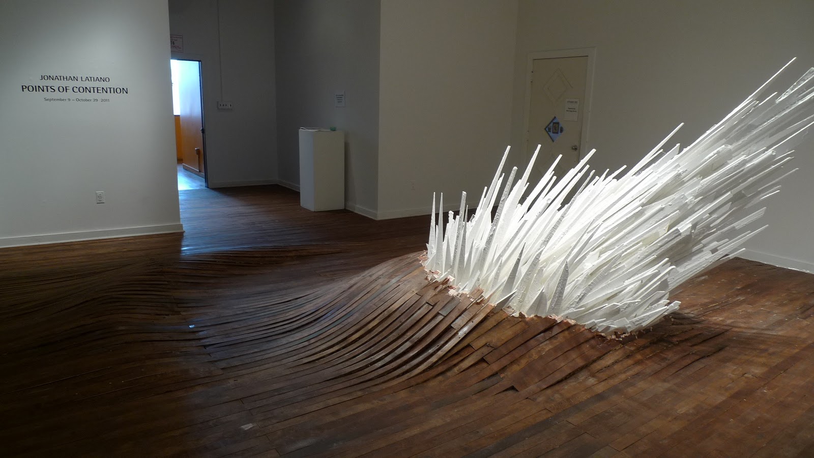 Walking into Points of Contention at School 33 Art Center is like stepping into a mirage. The hardwood floor, normally flat, ripples in tiny waves. In the center, a giant, crystalline structure glows with a chalky whiteness, as it explodes violently up and through the center of the floor. This installation is fascinating, in a “whodunit” kind of a way, because Jonathan Latiano’s construction doesn’t leave any clues as to its creation. Points of Contention appears, seamlessly, to be a part of its environment, as if it really has just burst through the floorboards.