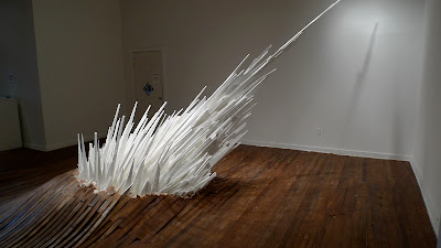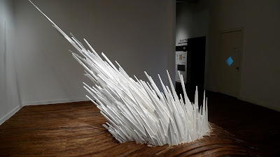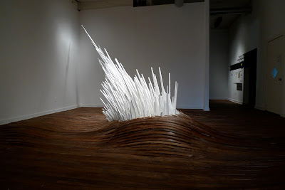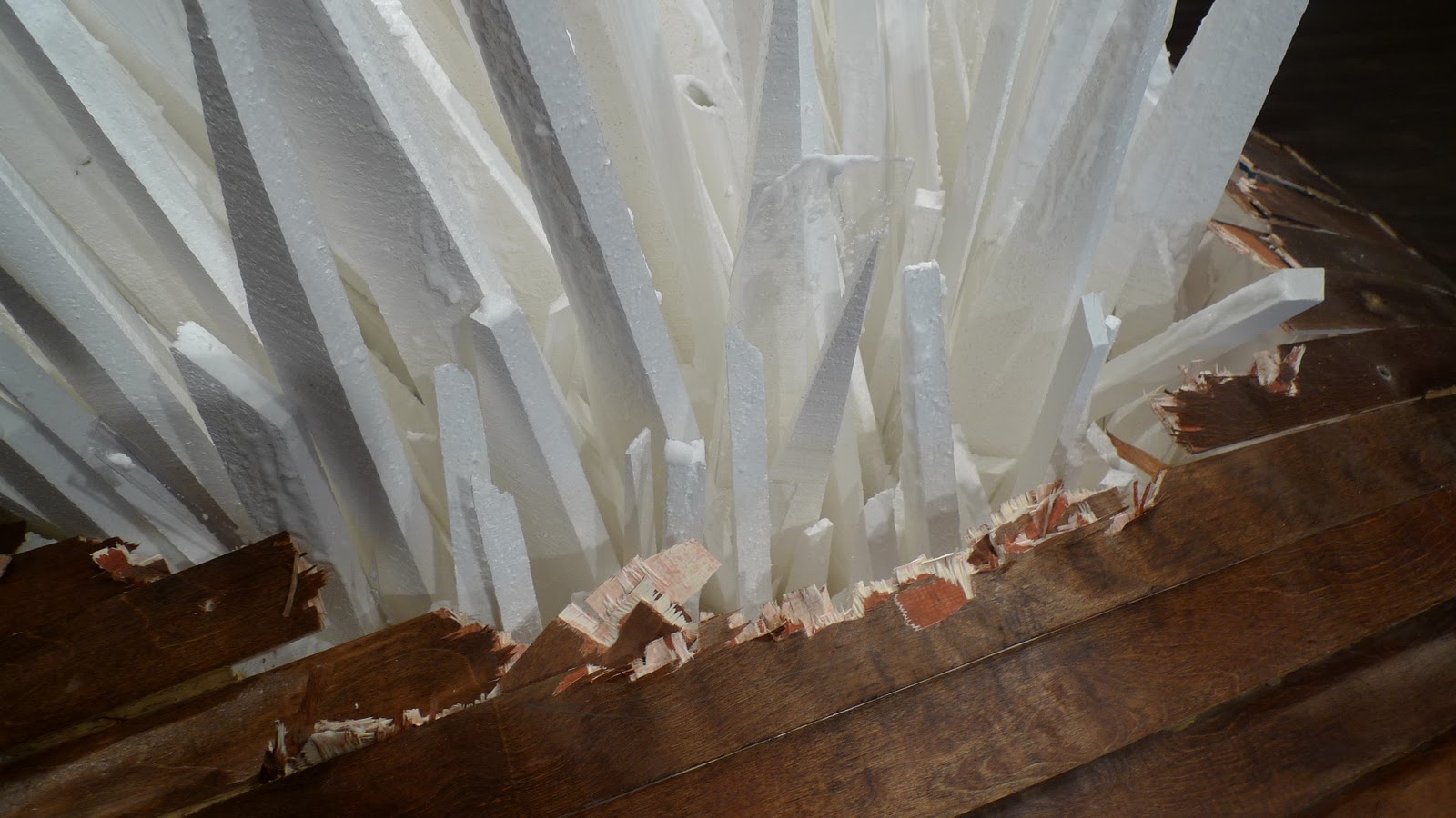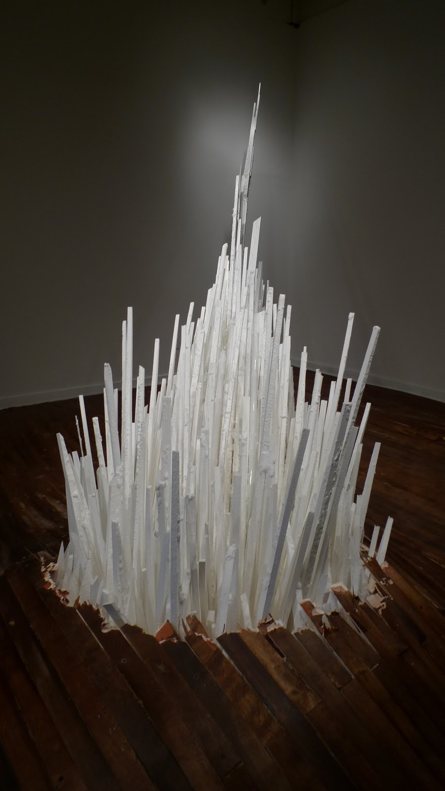 Walking into Points of Contention at School 33 Art Center is like stepping into a mirage. The hardwood floor, normally flat, ripples in tiny waves. In the center, a giant, crystalline structure glows with a chalky whiteness, as it explodes violently up and through the center of the floor. This installation is fascinating, in a “whodunit” kind of a way, because Jonathan Latiano’s construction doesn’t leave any clues as to its creation. Points of Contention appears, seamlessly, to be a part of its environment, as if it really has just burst through the floorboards.