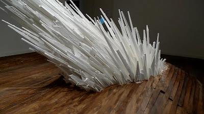 In his newest site-specific installation, Latiano explores the concept of geological movement by enveloping the viewer in a physical spectacle. By painstakingly reconstructing the floor, and encouraging you to walk on it, this immersive environment questions where the art begins and the building ends. And, although it shouldn’t be, the crystalline structure in the center is uncannily lifelike. The large, white explosion of wooden points could have been created by nature, or, possibly, a breakdown in natural forces.