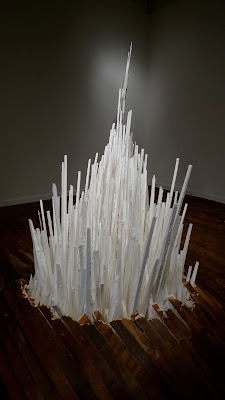 The main structure in the center of the room is comprised almost entirely out of thousands of pieces of found and re-purposed wood, plastic, Styrofoam, and glass; each piece was individually cut, painted, or transformed in some way. The sculpture was then coated in 50 pounds of a rendered down salt solution that I make. As the applied salt evaporates it forms its own patterns within the surface of the piece.