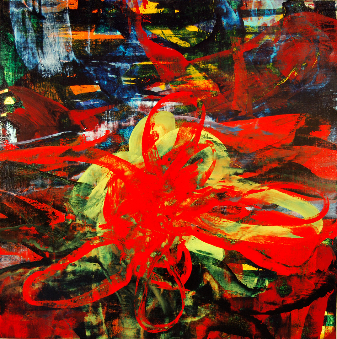 In his recent ventures into abstraction, Paul Jeanes explores quasi-chance driven processes: dripping, pouring, glazing and scraping in order to build paintings that visualize turbulent chromatic atmospheres where fleeting gestures are at once illuminated and obscured. Jeanes abides by the notion that the visualization of complex thought and a kind of psychosomatic energy can be conveyed through the simplest means of expression possible, in the static slurry of colored pigment on canvas. His current Visions of Excess series explores themes of corrosion, ablation, liquefaction, and stratification through a romantically incidental approach to painting. In this process-driven approach, Jeanes is part color abstractionist and part quixotic alchemist, who instinctively sublimates thought, with time and matter to create his thinly layered, hallucinatory paintings.
