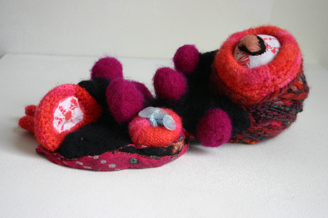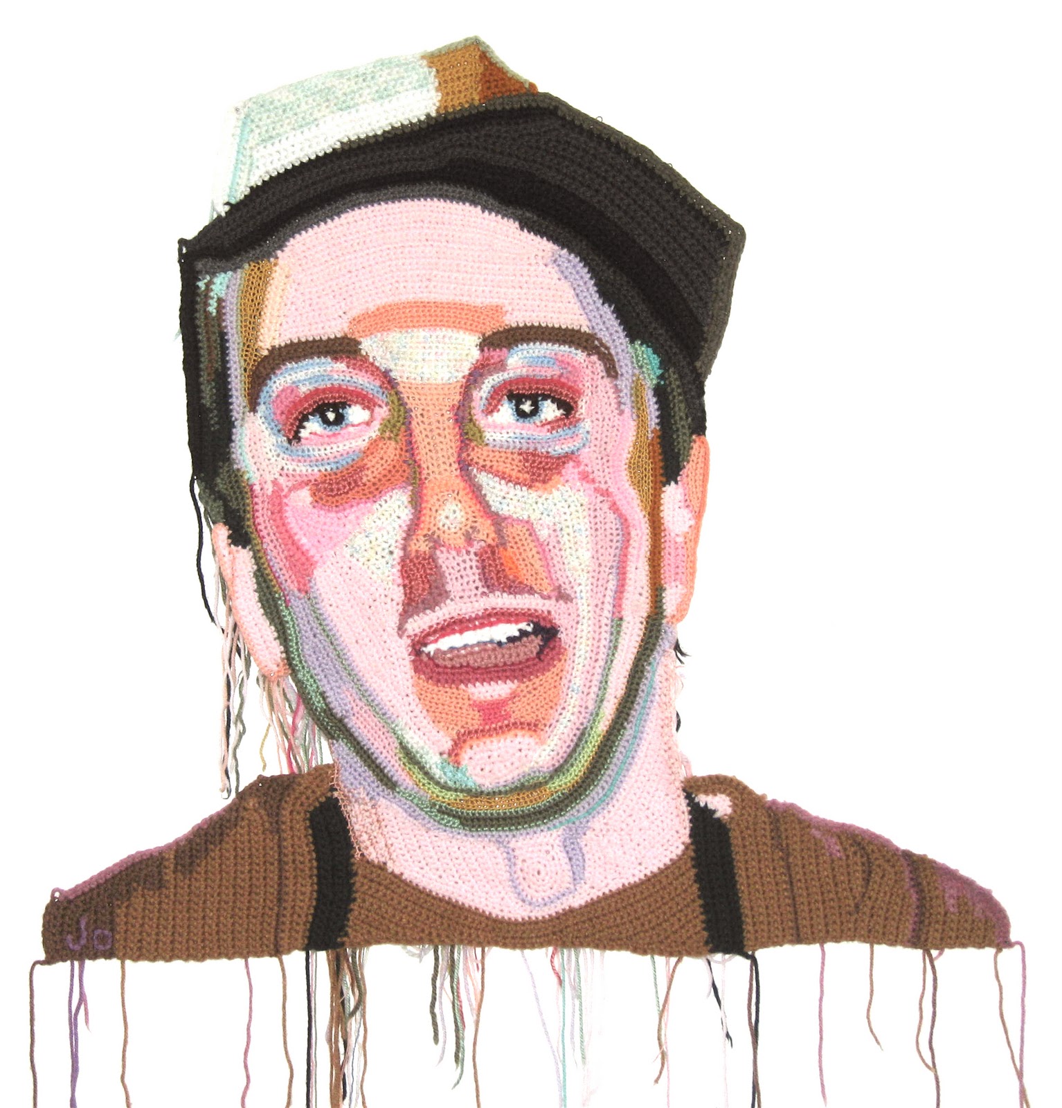 The use of yarn is historically based in craft techniques, often handed down from one generation to the next. Several of the artists in Gulp use yarn in a traditional way—weaving, sewing, crocheting—to create products which are decidedly nontraditional. Gina Denton’s soft sculptures embrace the sewing, felting, and stuffing techniques to create “alien” objects. Roughly the size of a stuffed animal in a range of bright, warm colors, Denton wants her works to be inviting; she wants viewers to touch and hold them, and describes their abstract and sometimes grotesque forms as “adult baby toys.” Another artist in the show, Jo Hamilton, uses yarn and a crochet hook to create highly realistic portraits in two dimensions. Hamilton works from her own photos and, despite their Photoshopped look, uses no computers, or even sketches, in her intuitive process. Using only traditional crochet techniques, Hamilton works one knot at a time, from the inside out, and row-by-row. Each portrait is larger than life and takes the artist about a month to complete. Due to their high degree of technical intricacy, these three portraits are among the most compelling works in the show.