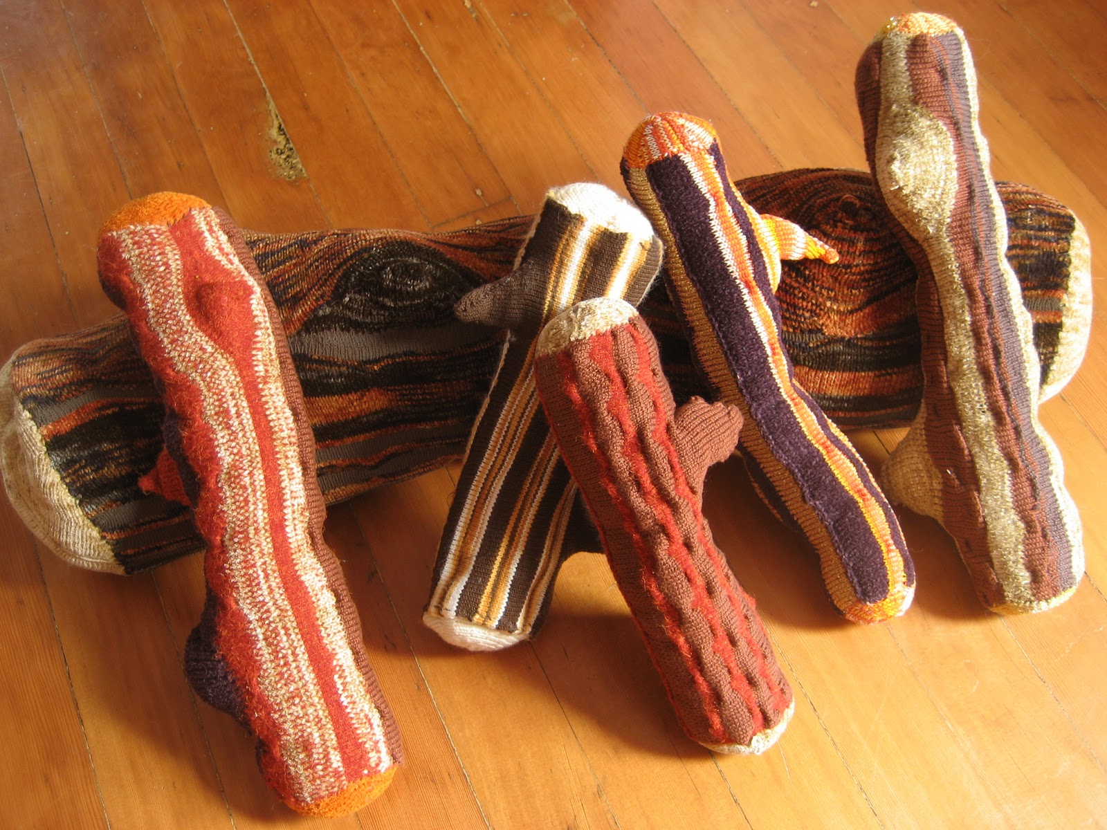 Like Boaz, Anthea Zeltzman’s knitted, three-dimensional logs function like a drawn-out inside joke. Arranged in three piles, reminiscent of a fireplace, Zeltzman’s logs vary in color and size and invite touching and giggling. Another artist, Ellen Nielsen, uses giant yarn pompoms in videos that are both funny and visually arresting. By amplifying traditional elements of craft, like sequins and pompoms, Neilson uses humor to explore feminist and queerist perspectives, as well as to “assert the value of girl culture and traditionally feminine craft practices.”
